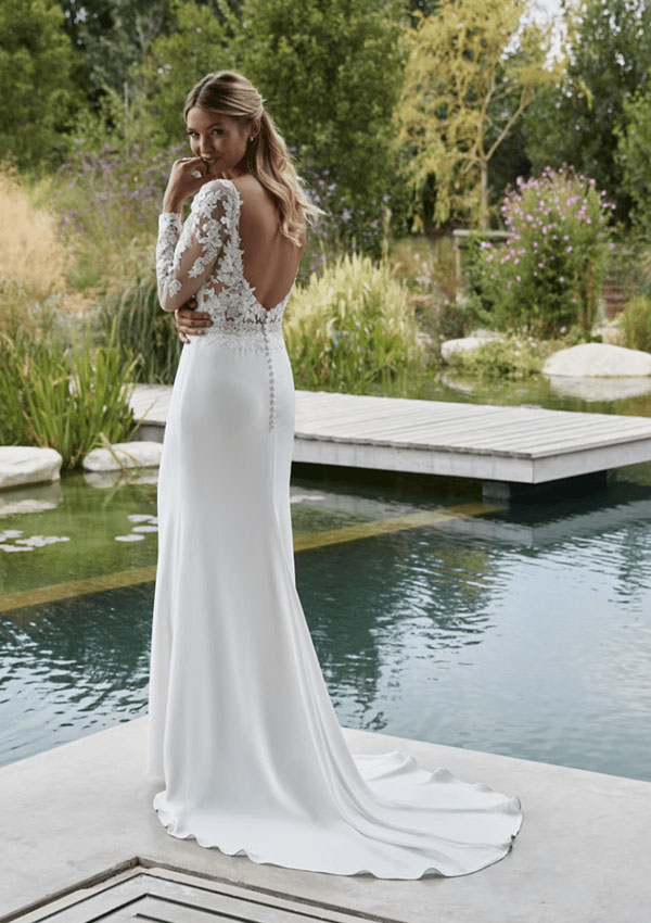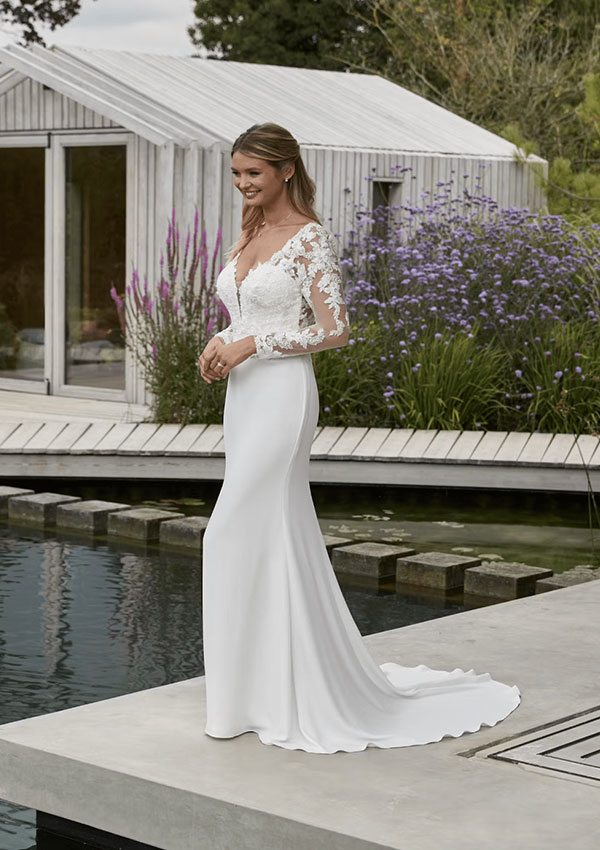 A jaw dropping crepe fit and flare with a plunging neckline and wonderful illusion sleeves. Shown in Ivory/Ivory, also available in Ivory/Light Rumpink.