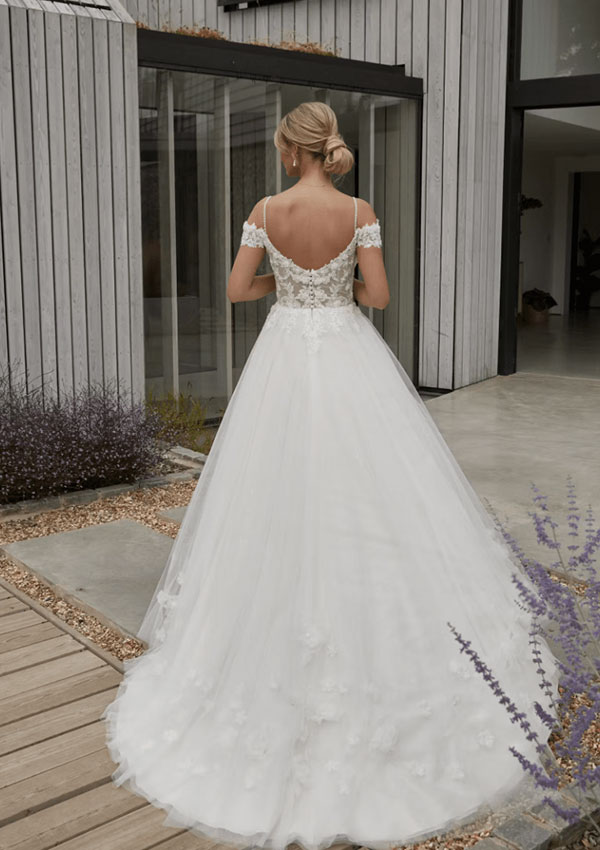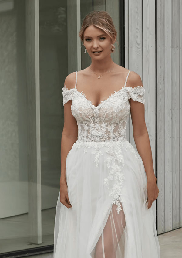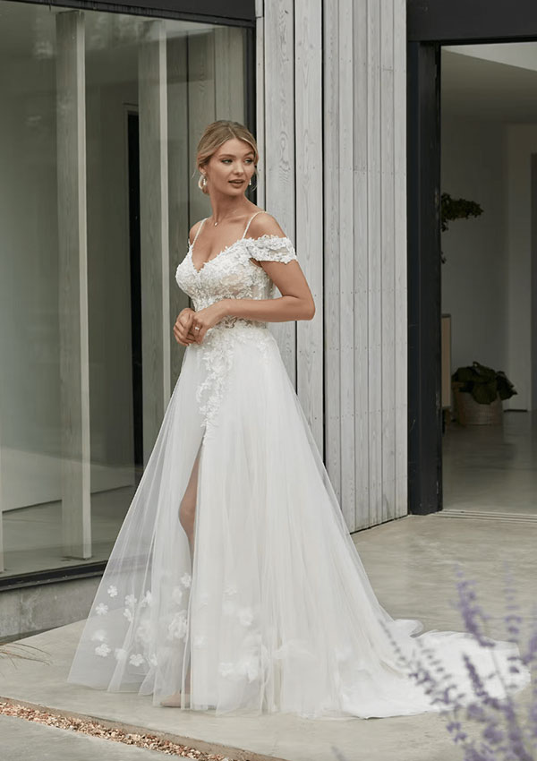 An amazing tulle dresss with a A-line silhouette, a V-neckline, off the shoulder sleeves and a leg slit. Shown in Ivory/Sand/Light Rumpink, also available in All Ivory.